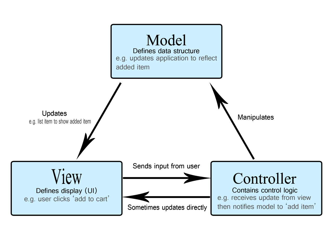 컨트롤러는 모델과 뷰의 상호작용을 감시하고 업데이트 합니다. View의 액션을 처리하며 Action을 통해 발생한 데이터를 가공하여 Model에 수정 요청 및 업데이트 요청을 합니다.